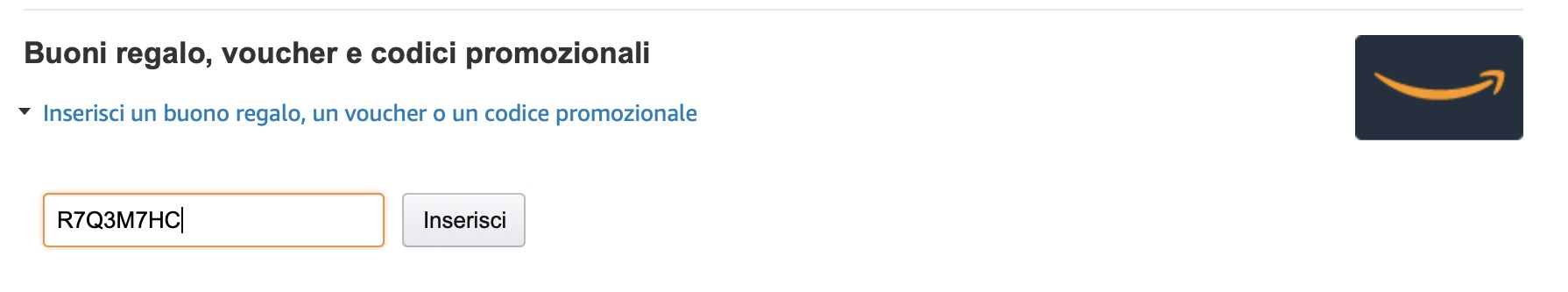 Per ottenere lo sconto, non dimenticare di utilizzare il codice R7Q3M7HC nella sezione “Buoni regalo, voucher e codici promozionali” che trovi prima del pagamento finale.