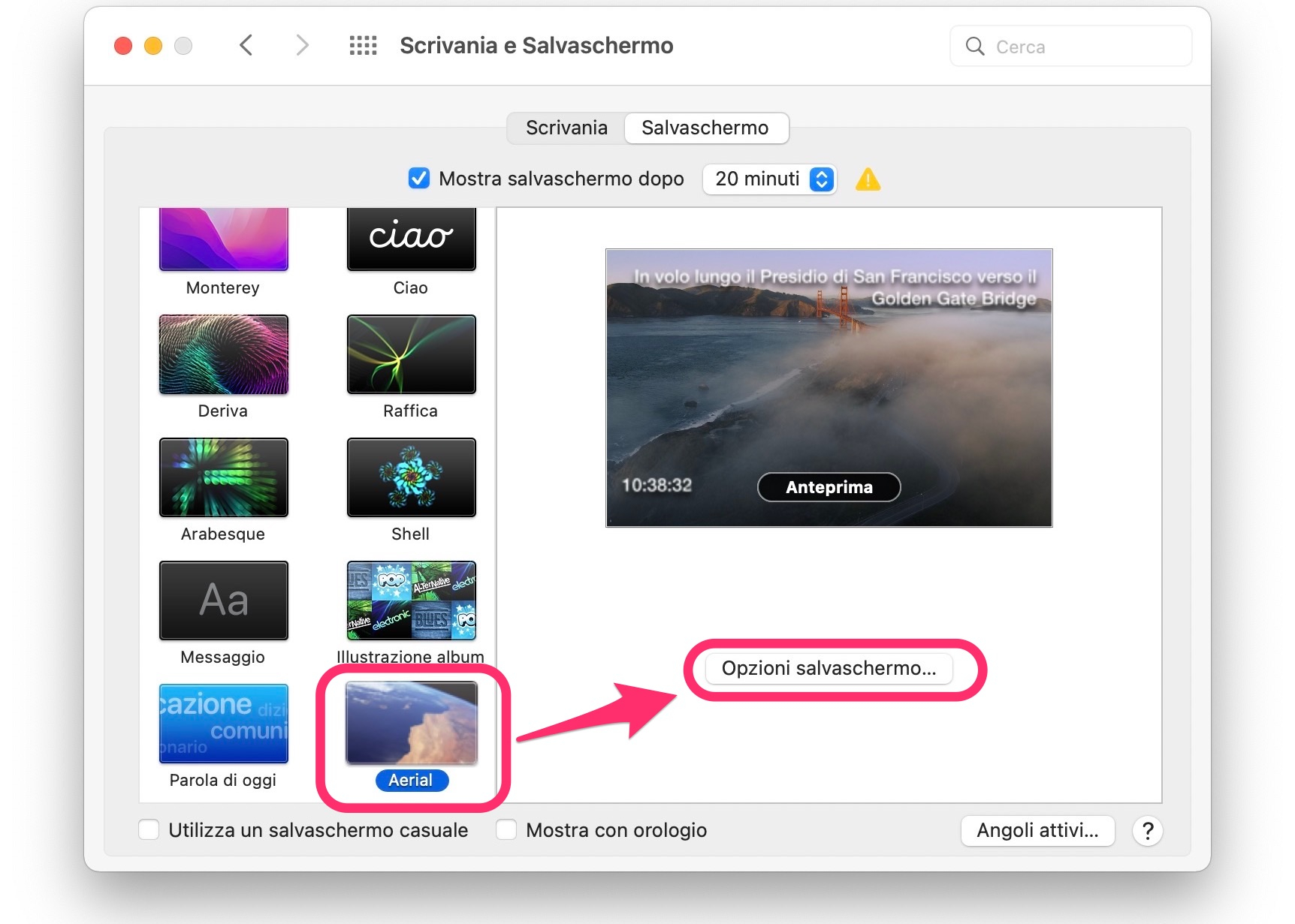 - Per configurare il salvaschermo, aprite Impostazioni → Scrivania e Salvaschermo → Aerial → Opzioni Salvaschermo e seguite le istruzioni di configurazione (noi abbiamo impostato 4K HDR).