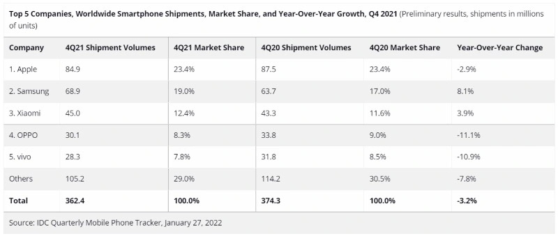 Solo che, mentre Xiaomi ha goduto della sua crescita annuale più elevata (quasi +30%), Samsung ha registrato il suo peggior risultato, con alle il 6% nel 2021; segno che Xiaomi è stato il produttore a guadagnare maggiormente dal declino di Huawei quest’anno. Ma anche Apple se l’è cavata piuttosto bene, con un buon 15,9% e soprattutto un importante +40% in Cina nel 2021.