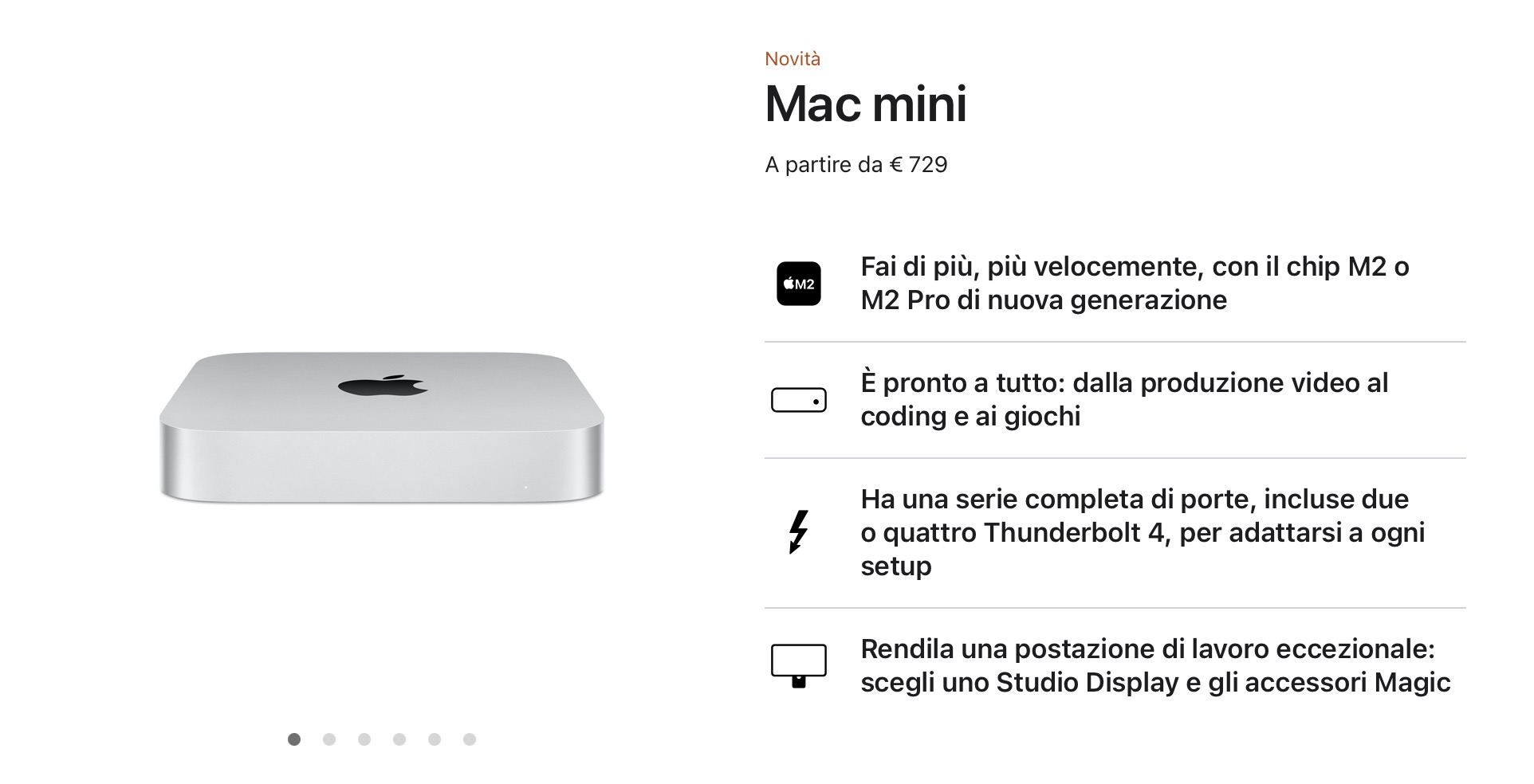 Non è un prodotto di fascia bassa, anzi. Il nuovo Mac mini con chip M2 vanta infatti una CPU a 8-core con 4 high-performance core e 4 high-efficiency core e una GPU a 10-core che lo rendono una scheggia. Il tutto con prezzi a partire da 729€, dunque un prezzo più conveniente rispetto alla generazione precedente.