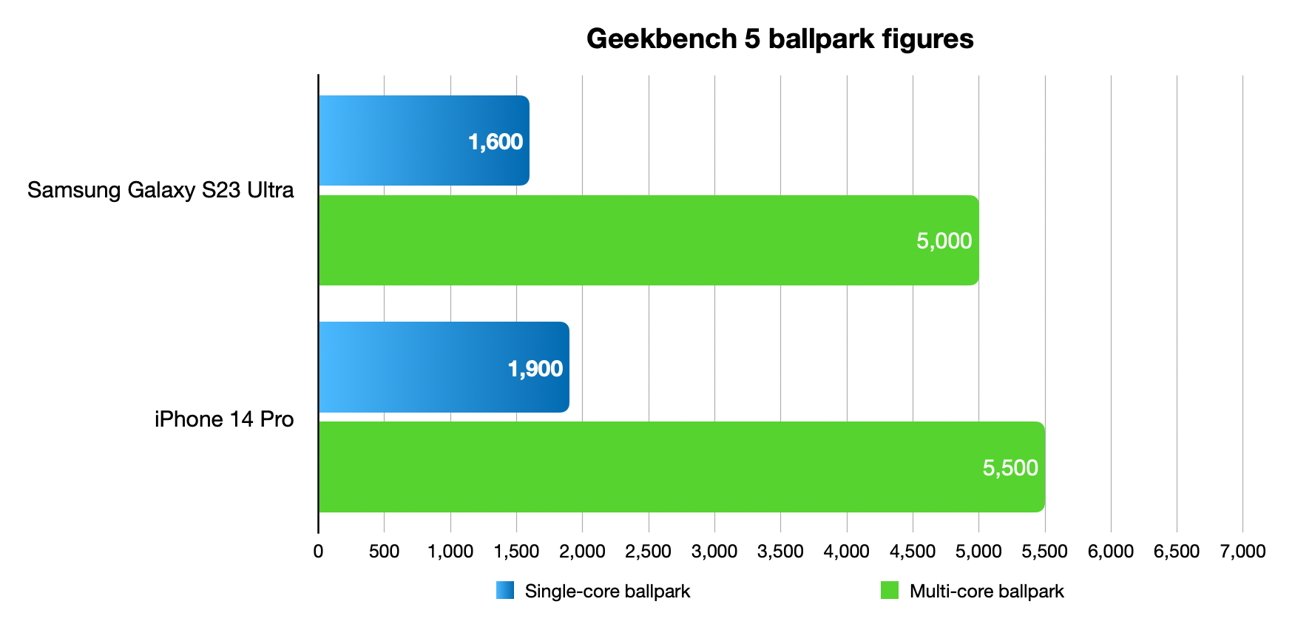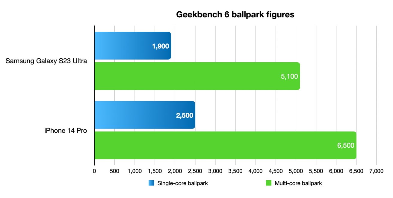 Guardate le immagini: i risultati dei benchmark, riportate da AppleInsider, sono impietosi. In pratica, se con Geekbench 5 il Galaxy S23 Ultra arrivava a 1.600 punti nei test a singolo core, e a 5.000 per quelli multi-core, le cose vanno molto diversamente con Geekbench 6. Con la nuova versione del software, il Galaxy S23 Ultra ottiene circa 1.900 per il test a singolo core e 5.100 per il multi-core, laddove iPhone 14 Pro arriva a 2.500 in singolo core e ben 6.500 in multi-core. Una differenza abissale.