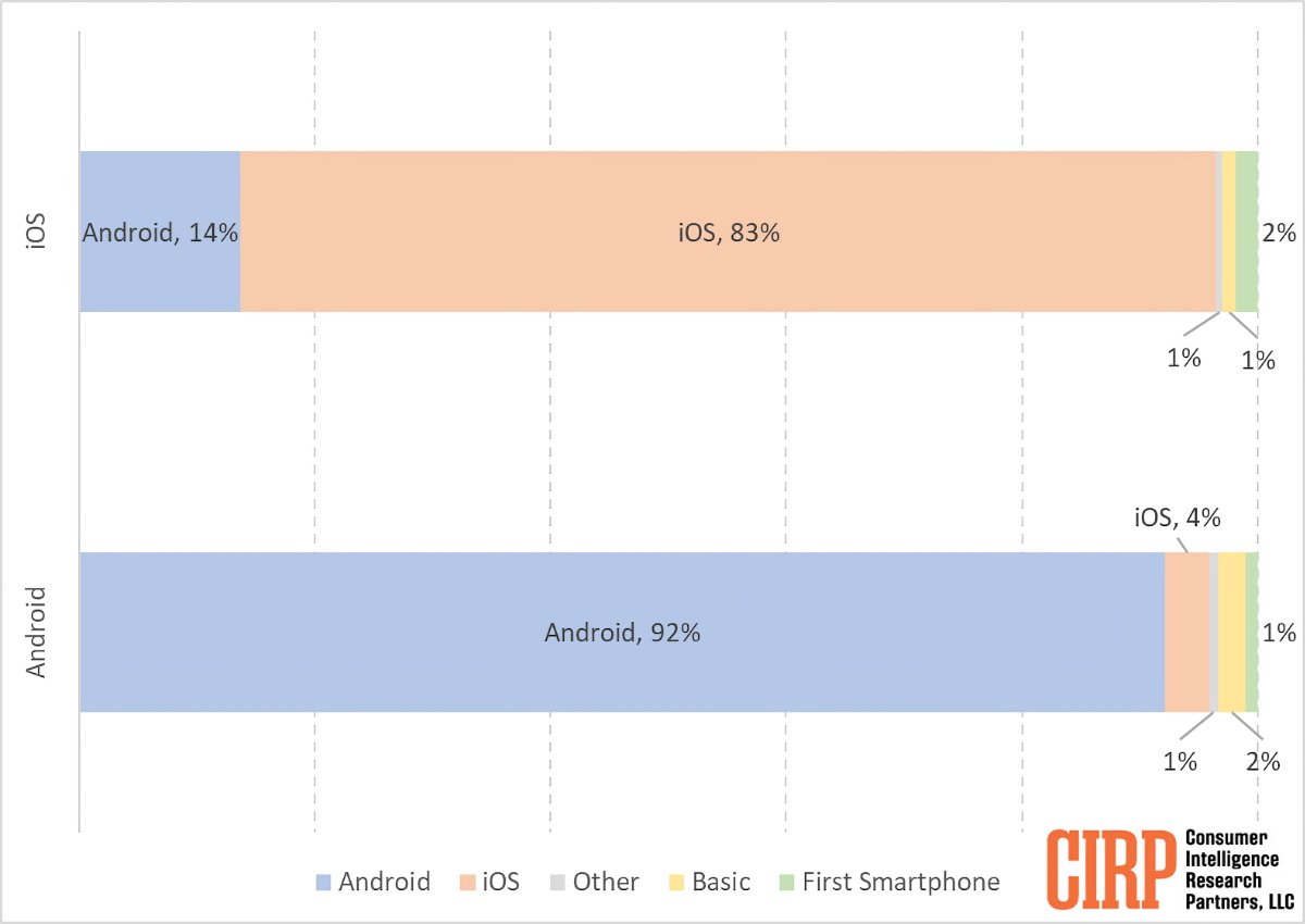Va notato che solo una piccola percentuale, meno del 5%, degli acquirenti per entrambe le piattaforme proveniva da sistemi operativi ormai fuori produzione, telefoni di base o flip, o individui che acquistavano il loro primo smartphone.