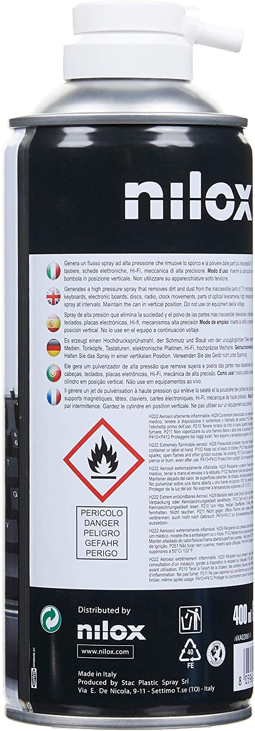 Ma l’utilizzo di questo prodotto non si limita solo alle tastiere dei computer, la bomboletta ad aria compressa Nilox può essere utilizzata per la pulizia di molteplici apparecchiature, come schede elettroniche, dispositivi ottici, testine magnetiche, dischi fissi, circuiti stampati e molto altro ancora. Inoltre è molto utile per pulire oggetti di uso quotidiano come notebook, stampanti, macchine fotografiche, apparecchiature digitali, orologi e apparecchi scientifici o di precisione.