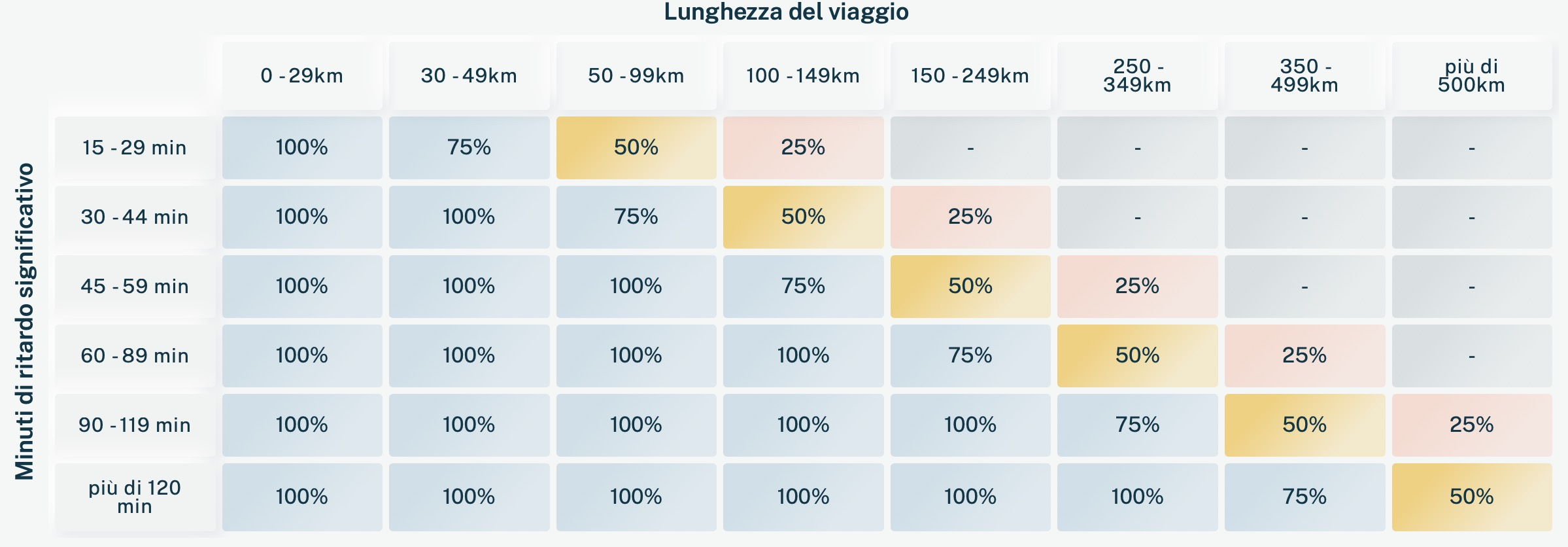 Rimborso per ritardi compresi tra 90 e 119 minutiIn caso di ritardo compreso tra 90 e 119 minuti, Free To X ti riconosce un rimborso pari al: