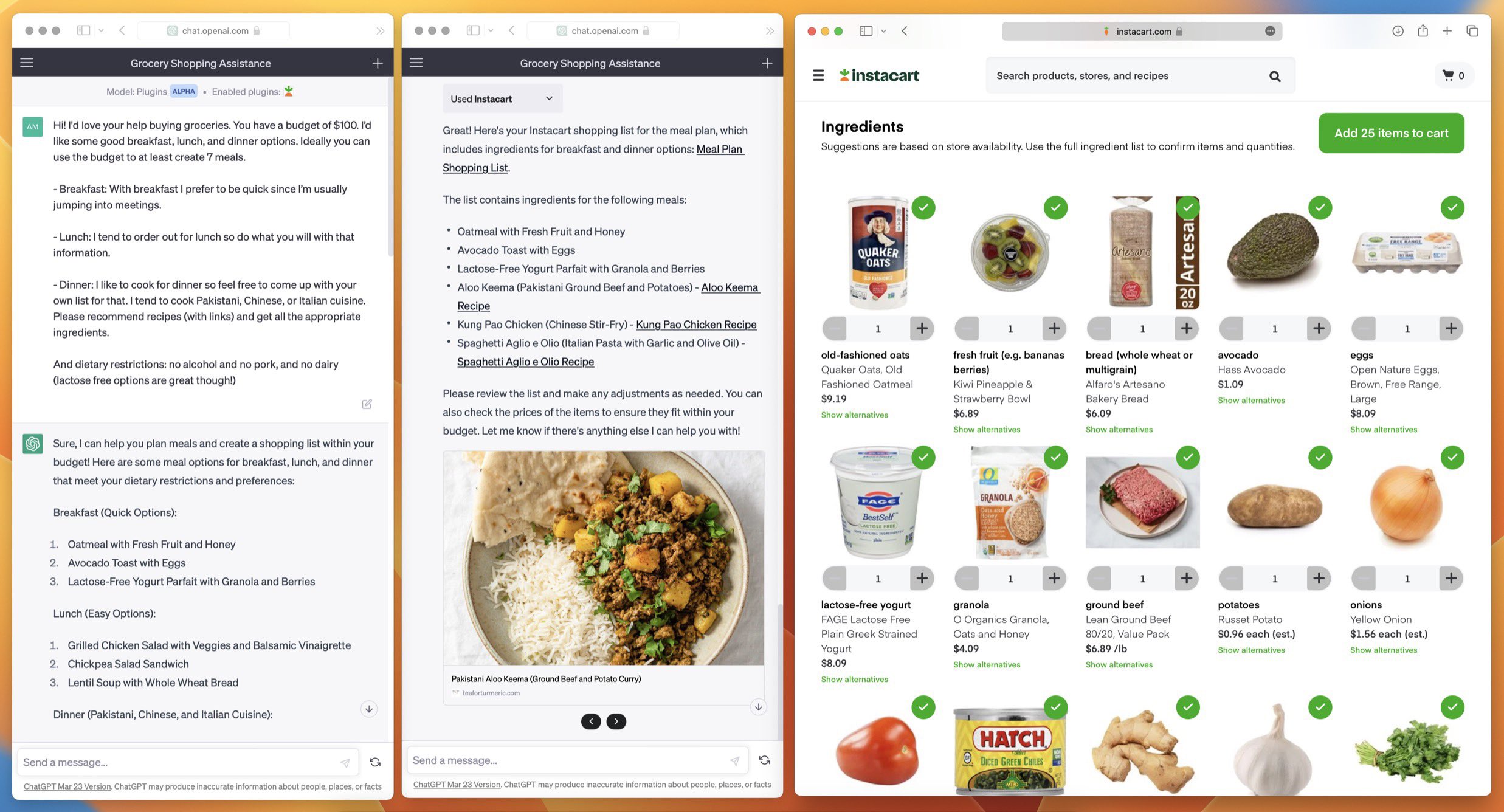 Come possono queste tecnologie aiutarci a fare la spesa? Semplice: basta chiedere loro di generare una lista della spesa ottimale per noi, specificando il budget, le nostre calorie giornaliere e i nostri gusti. “Ho chiesto a ChatGPT di fare la spesa oggi usando il plug-in di @Instacart e ha funzionato benissimo!” spiega su Twitter un utente. “Sono rimasto nei limiti del mio budget, mi ha fornito ingredienti e ricette per 7 pasti (compresi alcuni preferiti!) e ha tenuto conto del mio programma e della mia dieta.”