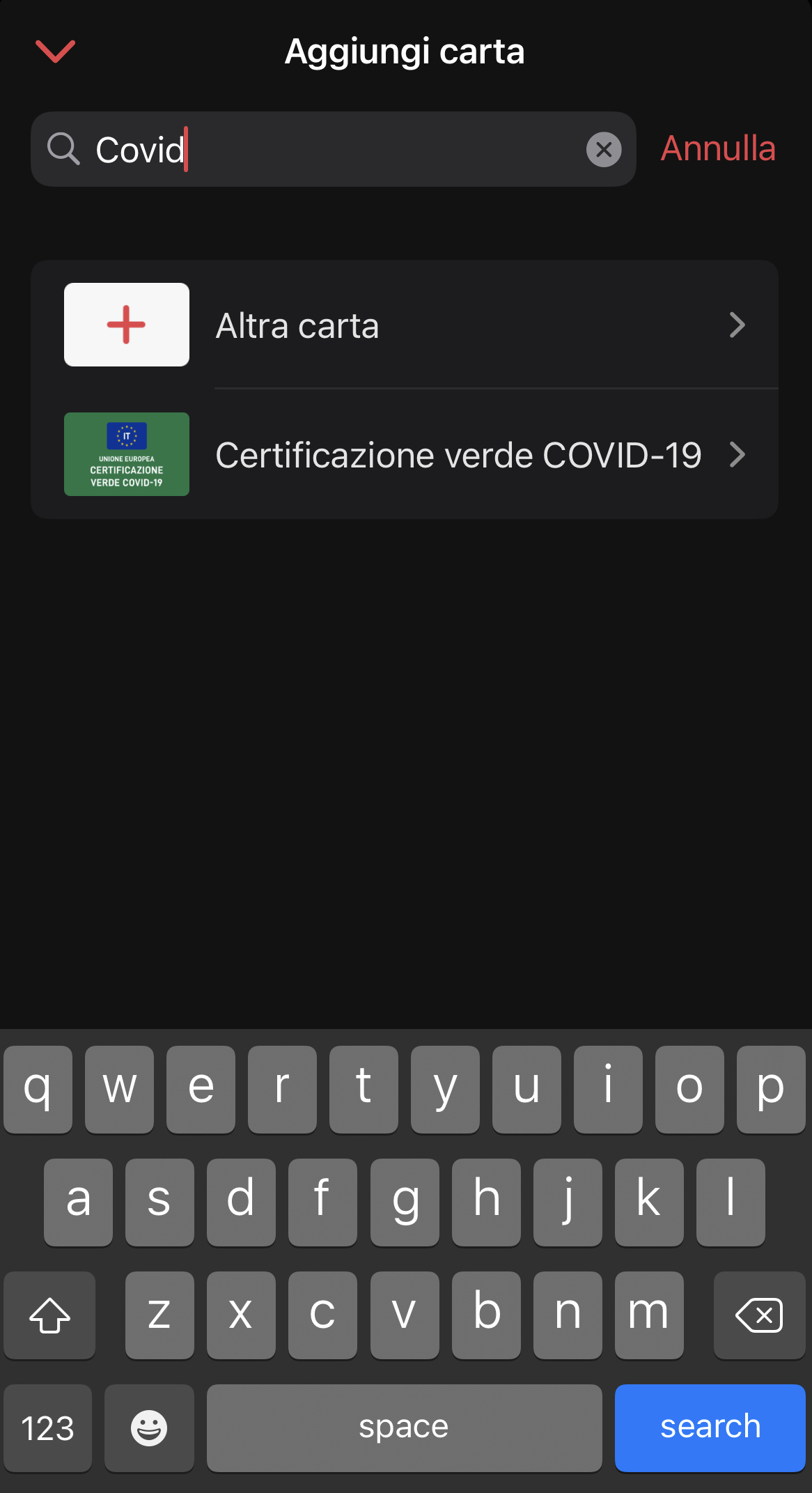 Una volta scaricata l’app Stocard a questo indirizzo vi basterà fare un tap sul “+" in alto a destra e cercare “Certificazione Verde COVID-19" nell’apposito campo di ricerca – o in alternativa scorrere il lungo elenco e selezionare la stessa voce. Ora avete tre opzioni: