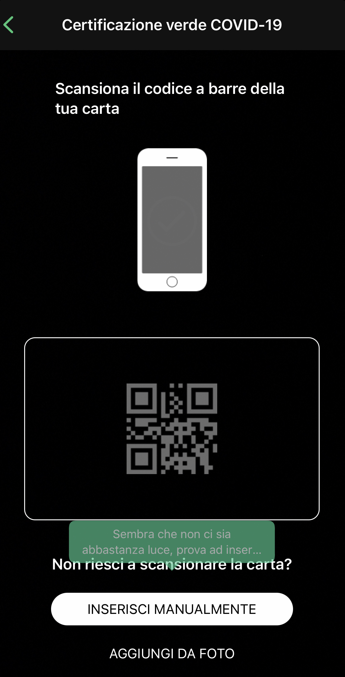 - Genera il codice: La prima cosa da fare è scaricare il codice QR del tuo Green Pass (Certificazione Verde)dall’applicazione IO. Basta anche uno screenshot nel Rullino.
