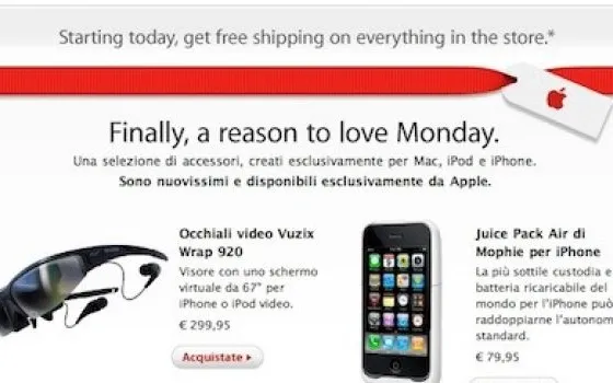 Piccolo giallo sull’Apple Store dove, da qualche ora, è comparso un banner che annuncia la consegna gratuita di tutti i prodotti. Tutto a posto, quindi, non foss’altro che il testo è in inglese e non si ha notizia di ulteriori dettagli. Svista o anticipazione?