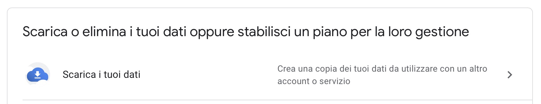 - Scorrete fino a trovare la voce Scarica o elimina i tuoi dati oppure stabilisci un piano per la loro gestione e infine fate clic su Scarica i tuoi dati.