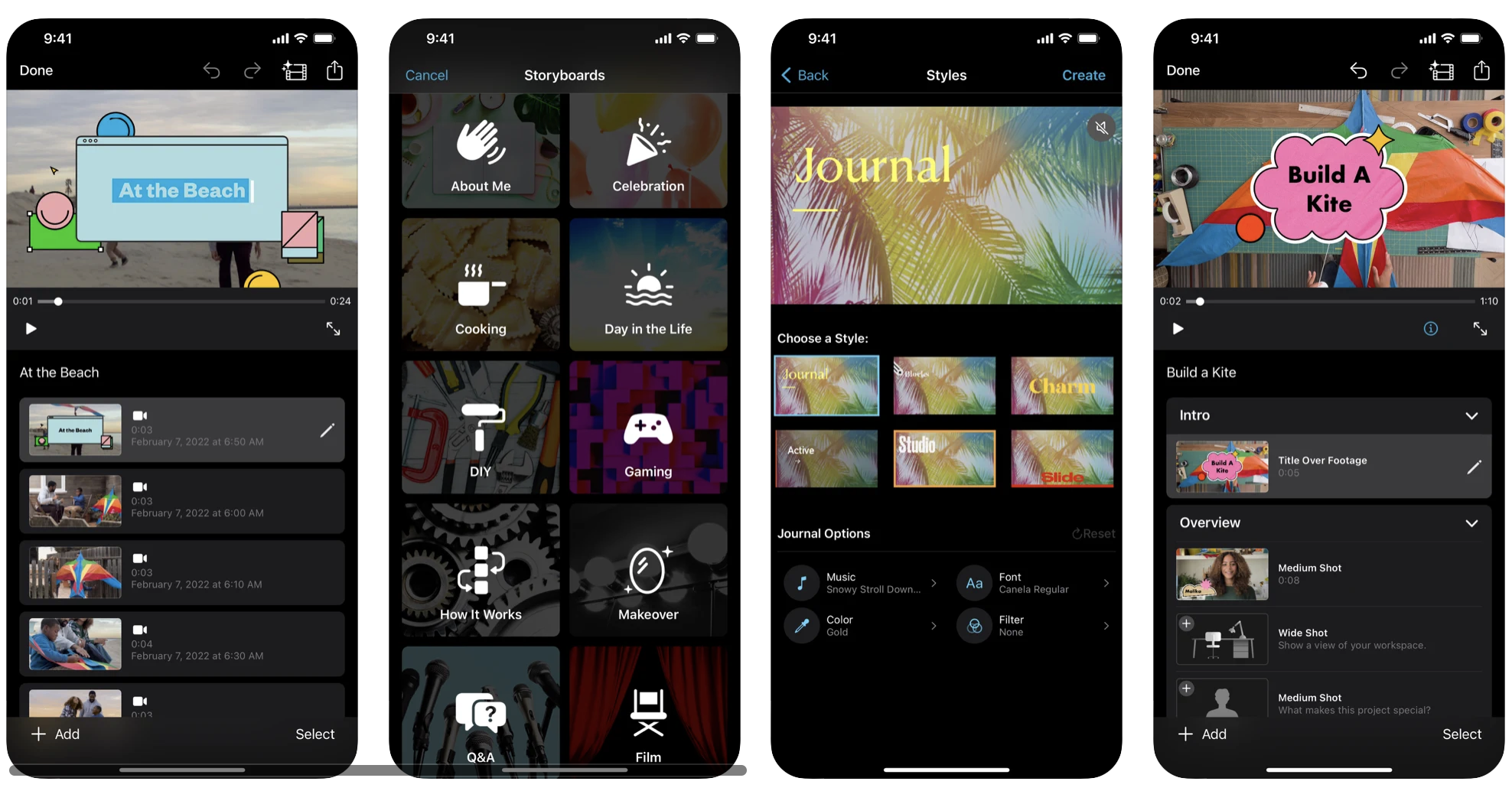 Con gli Storyboard invece impari a raccontare e pianificare il girato come a Hollywood. “Scegli tra 20 storyboard che ti guidano nella creazione di vari tipi di video popolari”, “registra video o scatta foto direttamente nei clip segnaposto o aggiungi file multimediali dalla libreria di Foto. Dopodiché “Aggiungi, riordina ed elimina i clip come vuoi per organizzare e personalizzare la tua storia e applica uno stile visivo dinamico che include layout dei titoli, font, filtri, palette cromatiche e musica.”