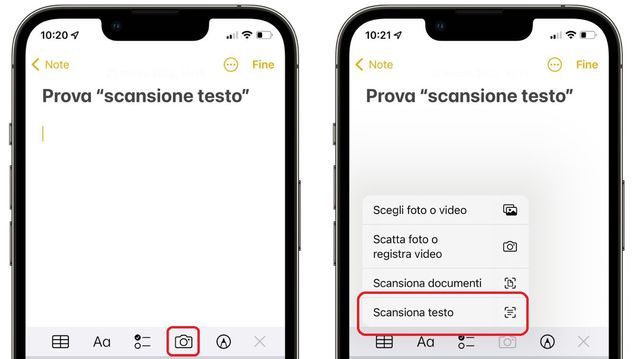 Dopodiché, basta lanciare l’applicazione di sistema Note, creare una nuova nota (o aprirne una già esistente) e poi toccare l’icona della fotocamera. Si trova nel menu orizzontale posizionato sopra la tastiera. Ora dovresti notare la scorciatoia “Scansiona testo”.