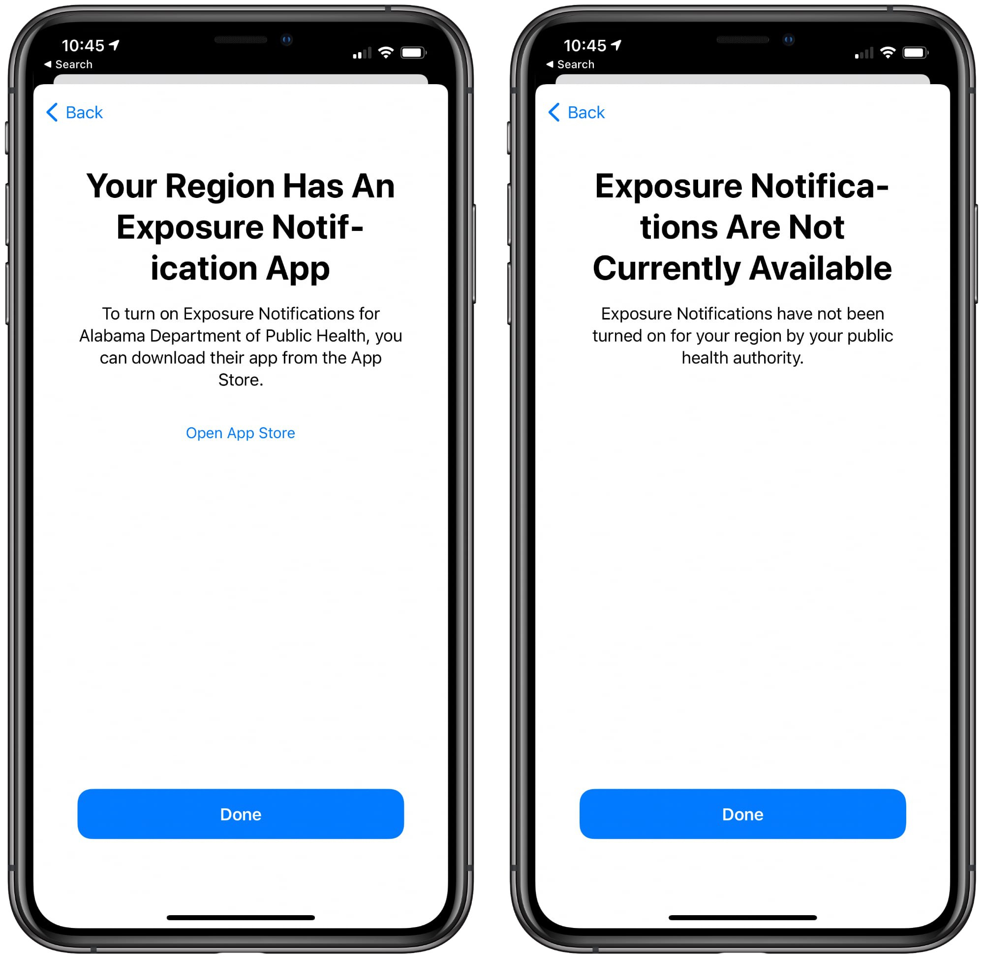 - Notifiche Esposizioni: Quando si tenta di abilitare Notifiche Esposizioni Covid-19, iPhone mostra un pannello per scegliere paese, regione o Stato, e informa l’utente dell’app eventualmente in uso dal governo per la sua area.