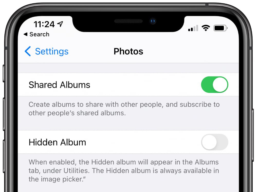 - Album Nascosti: All’interno dell’app Foto ora c’è un’opzione che permette di mostrare o nascondere determinati Album; le foto contenute al loro interno restano tuttavia visibili nella Libreria ma in compenso l’accesso può essere bloccato con Face ID/Touch ID.