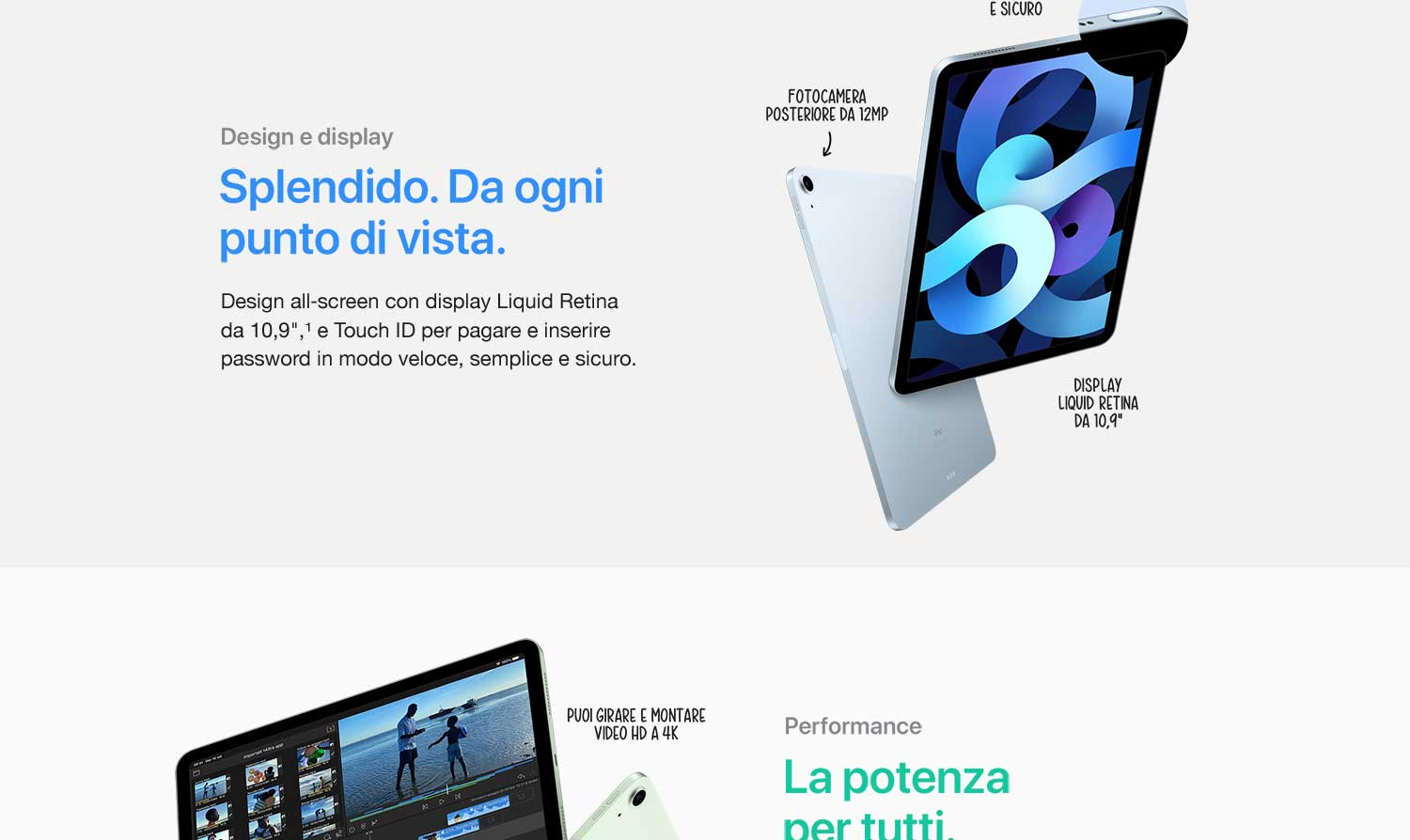 Display Liquid Retina da 10,9″ con True Tone e ampia gamma cromatica P3, Chip A14 Bionic con Neural Engine, Touch ID per l’autenticazione sicura e Apple Pay, fotocamera posteriore da 12 MP, fotocamera frontale FaceTime HD da 7 MP, ampio suono stereo, Wi-Fi 6 (802.11ax) e reti cellulari 4G LTE Advanced. L’ultima generazione di iPad Air è il tablet perfetto per DAD, Smart Working e intrattenimento.