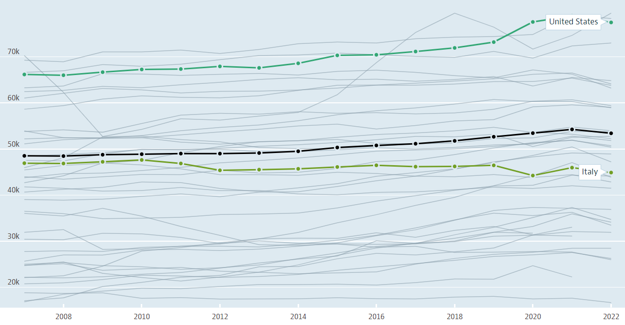 L’Italia è il fanalino di coda anche in Europa, mentre gli altri paesi del vecchio continente vantano una crescita più o meno consistente dei salari, come indicato negli ultimi report OCSE.
