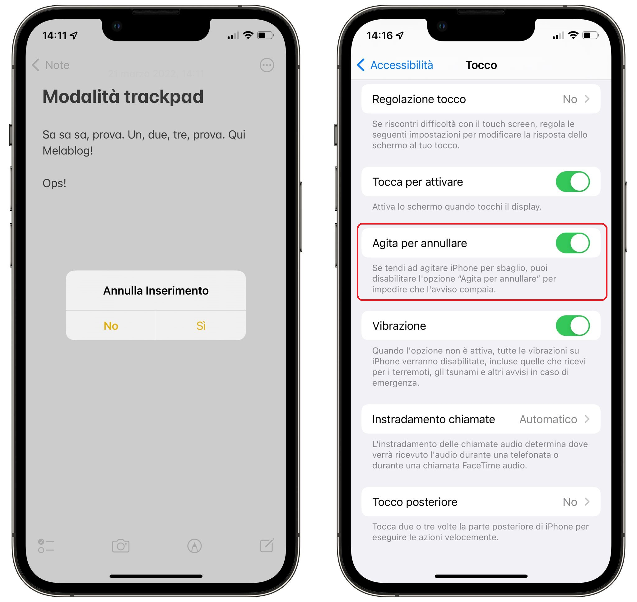 Recati in Impostazioni → Accessibilità → Tocco → Agita per annullare.