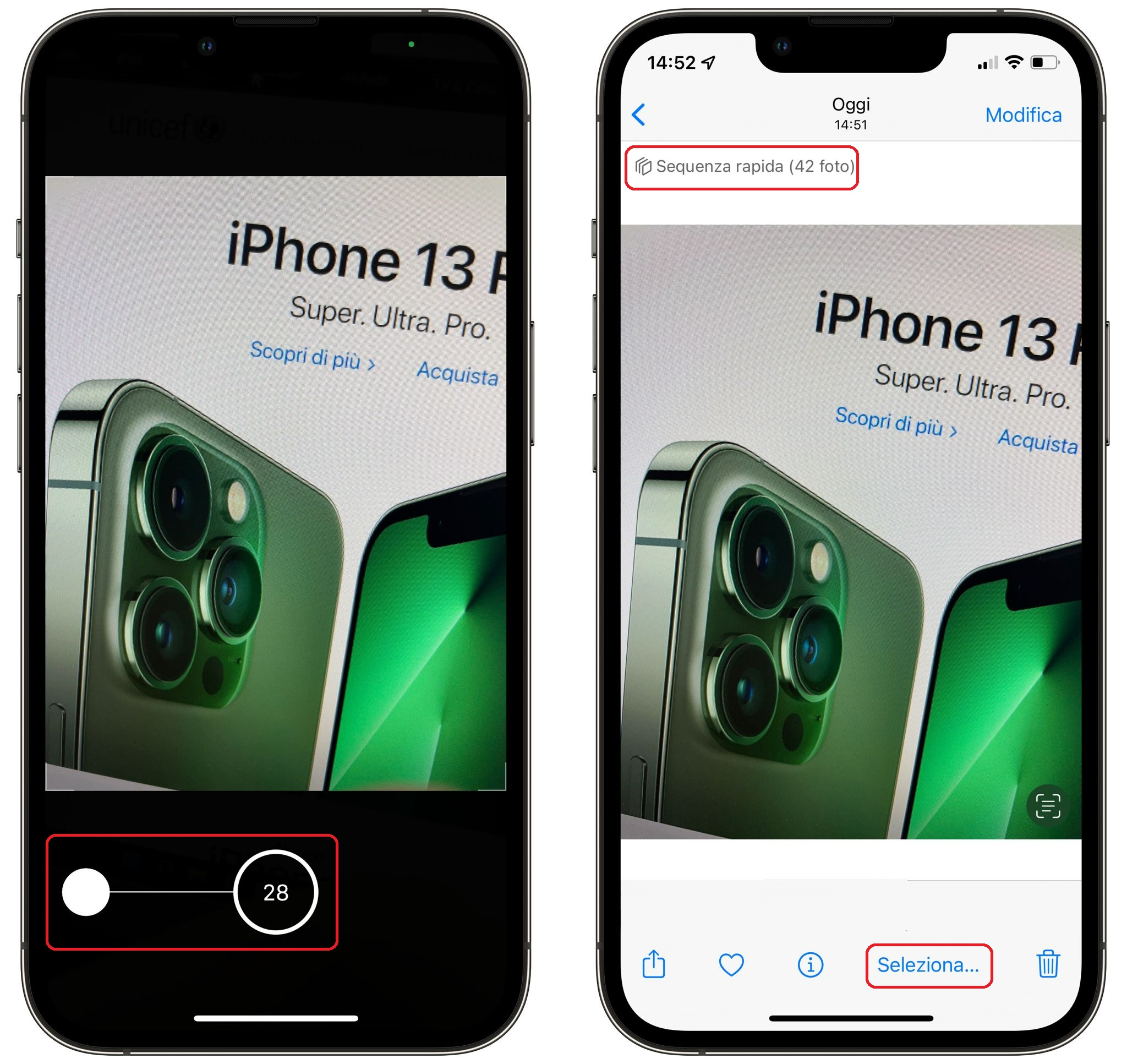 Sei ancora in “modalità foto”? Benissimo, partendo dal pulsante per lo scatto (quello bianco), effettua uno swipe verso sinistra. Tieni premuto per scattare fotografie in sequenza, e alza il dito quando hai finito.
