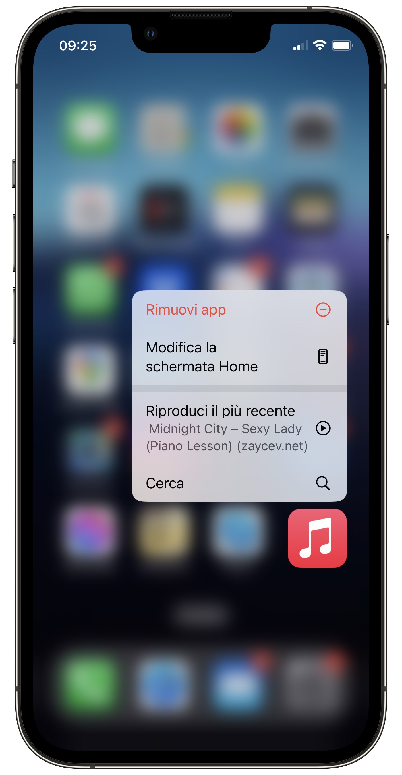 - Tieni premuta l’icona dell’app Musica sulla schermata Home fino a quando non appare un menu