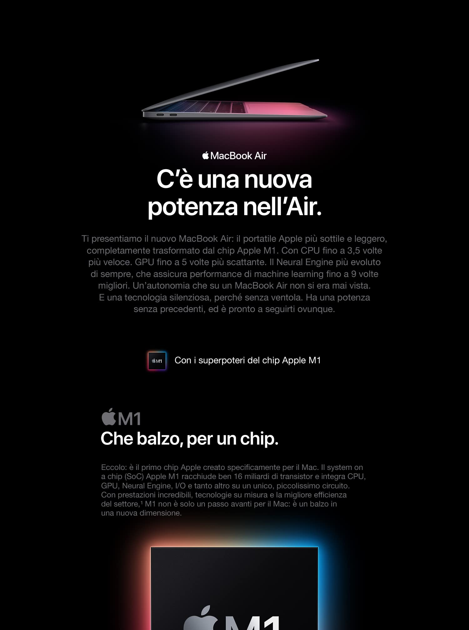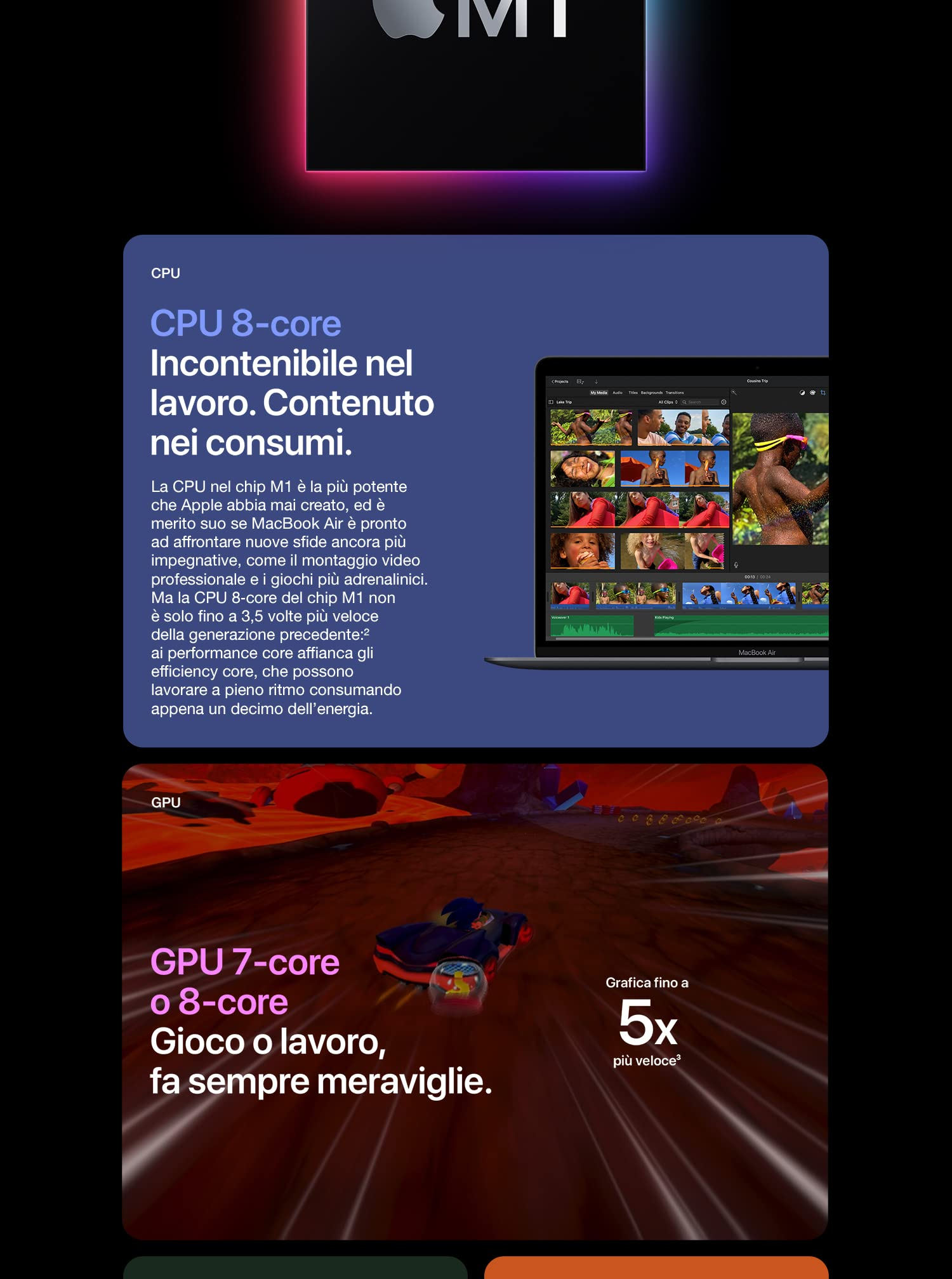 - Più potenza – È pronto ad affrontare anche le sfide più impegnative, come il montaggio video professionale e i giochi più adrenalinici. Il chip Apple M1 con CPU 8-core offre prestazioni fino a 3,5 volte più veloci rispetto alla generazione precedente, consumando meno energia.