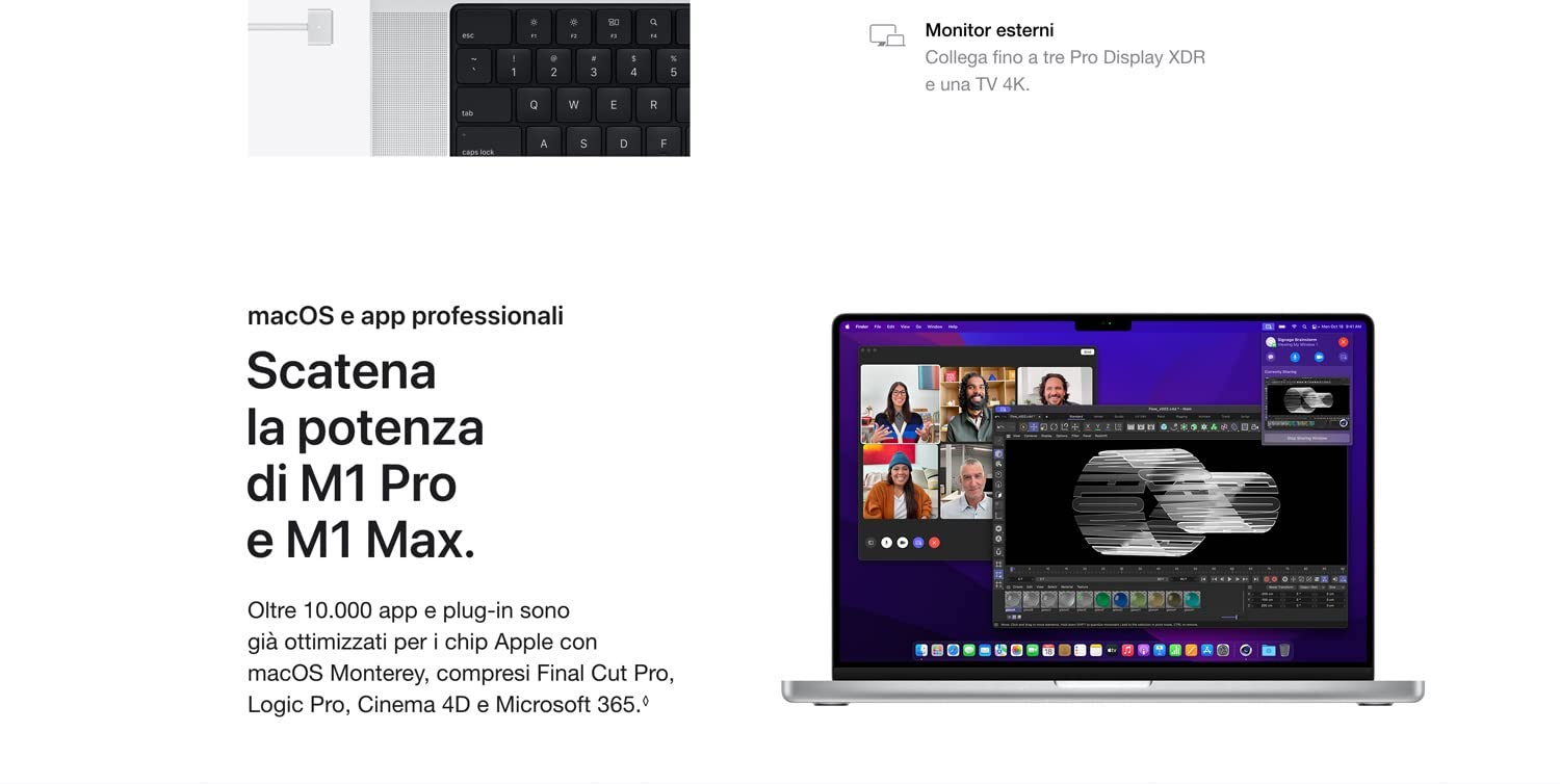 Questo MacBook Pro è potente, versatile e molto espandibile. Include un Chip Apple M1 Pro con CPU 10-core e GPU 16-core con prestazioni fino a 2 volte più veloci, Neural Engine 16-core per un apprendimento automatico fino a 5 volte più rapido e ben 21 ore di autonomia.