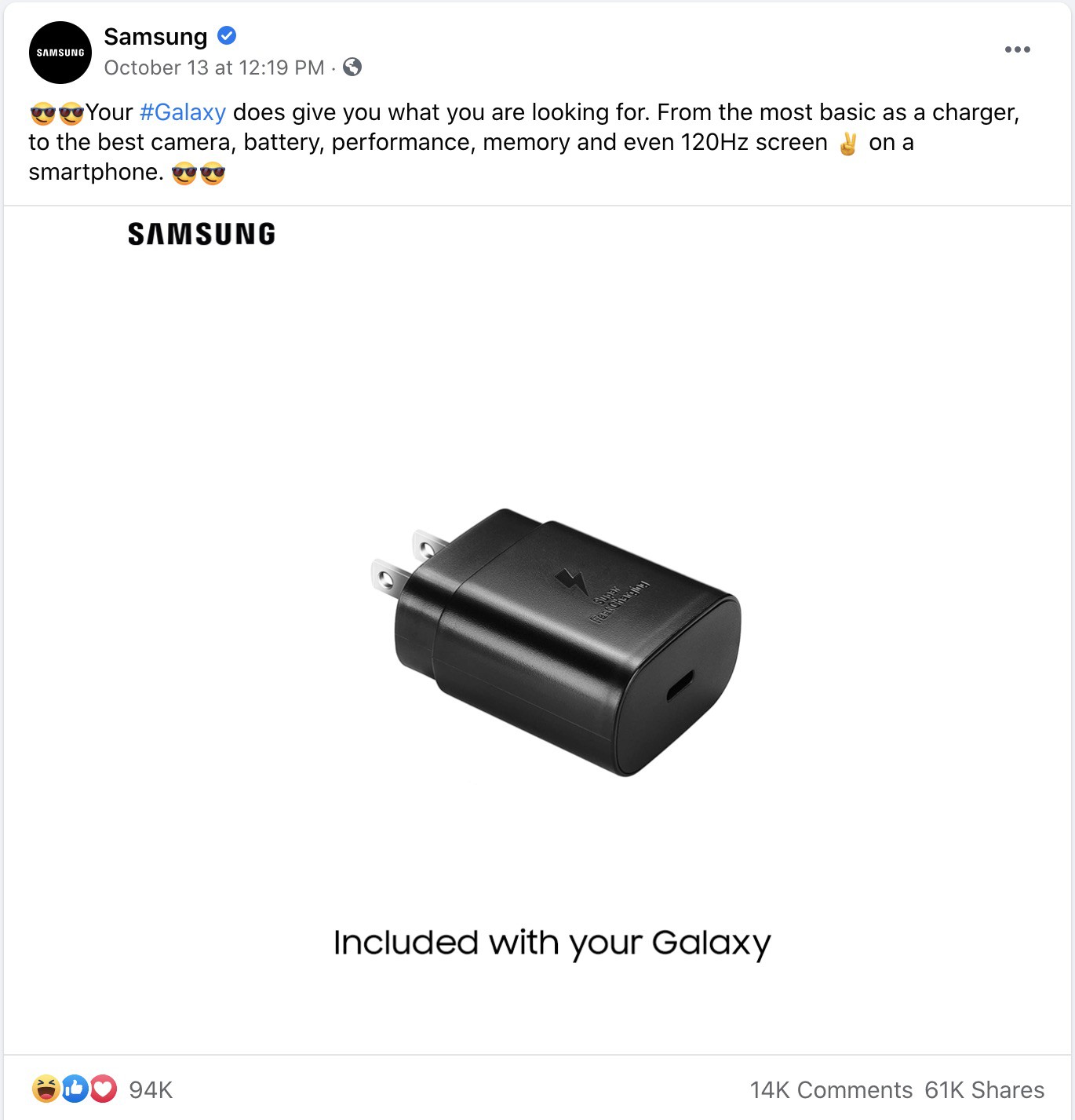 Sotto campeggia la foto di un caricabatterie e la dicitura “incluso col tuo Galaxy.” Ça va sans dire, ha fatto jackpot di Like.