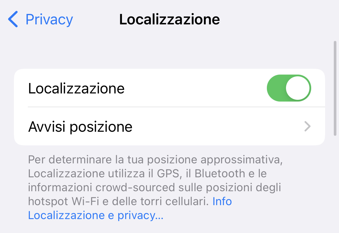 Apri Impostazioni → Privacy → Localizzazione e disattiva l’interruttore Localizzazione. In alternativa, puoi disattivare la localizzazione per ogni singola app che non lo merita. Senza alcuna pietà.