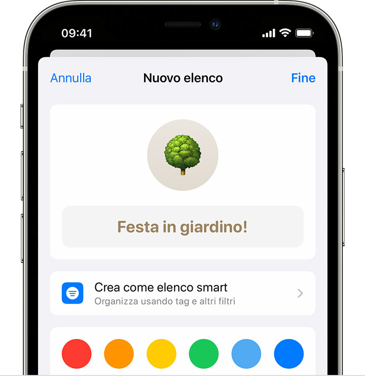 L’app Promemoria permette di personalizzare le liste aggiungendo icone, colori o cambiandone il nome. Puoi perfino convertirla in un Elenco Smart.