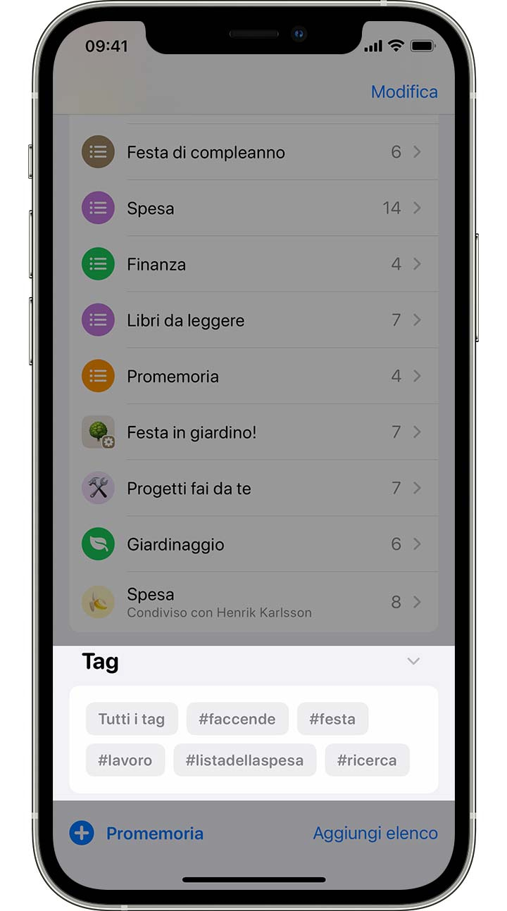 Con gli elenchi smart hai una vista rapida di tutti i promemoria presenti nei tuoi elenchi. Puoi anche creare elenchi smart personalizzati, raggruppati automaticamente in base a regole che puoi definire. I promemoria corrispondenti ai tag e ai filtri di un elenco smart vengono automaticamente aggiunti all’elenco.
