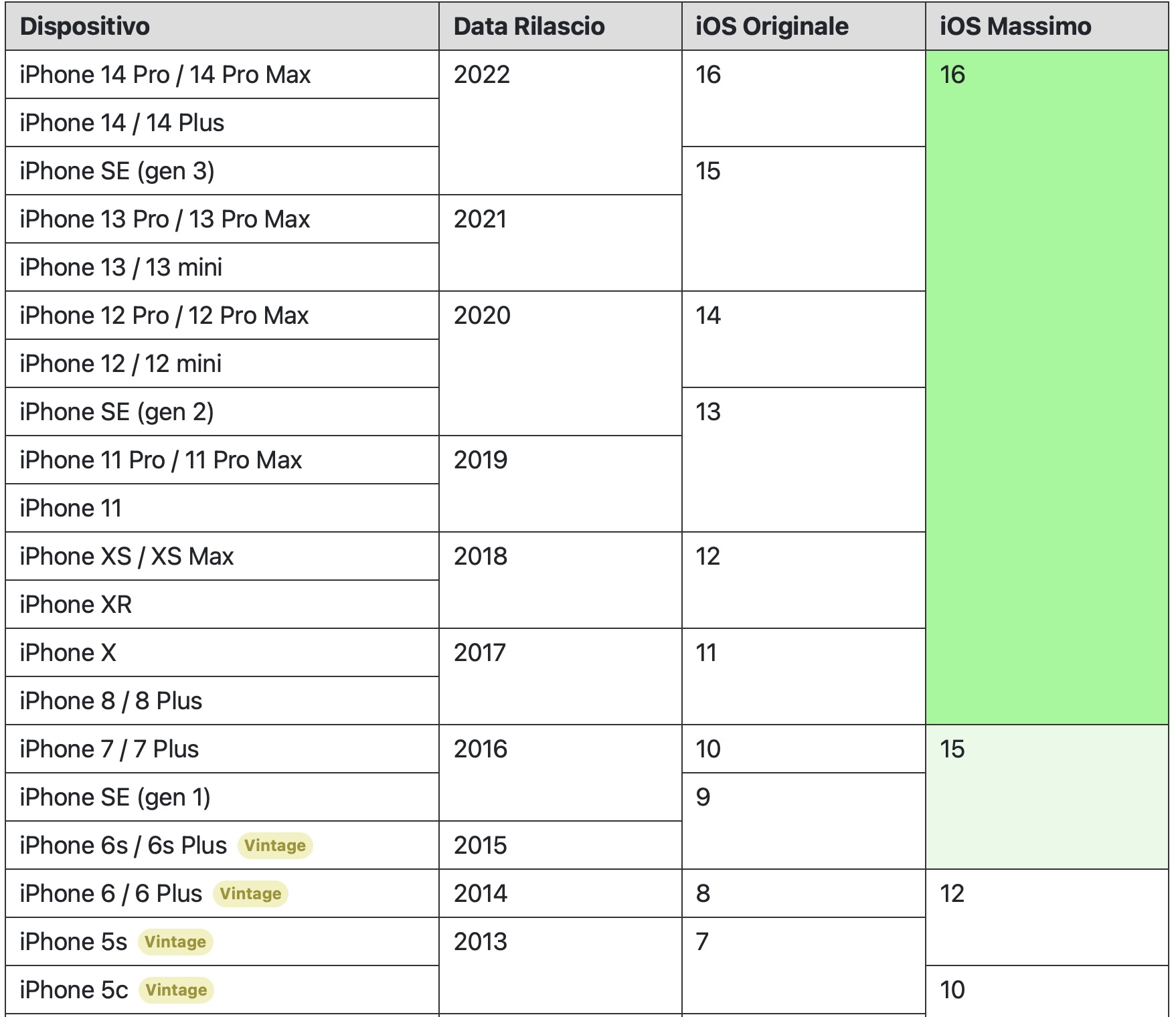 Grazie a questa tabella siamo in grado di scorgere a colpo d’occhio che, ad esempio, per poter installare iOS 16 serve almeno un iPhone 8. iPhone 6S Plus e iPhone 7 si sono fermati ad iOS 15; e iPhone 6s e iPhone 5s sono fermi vincolati a iOS 12.