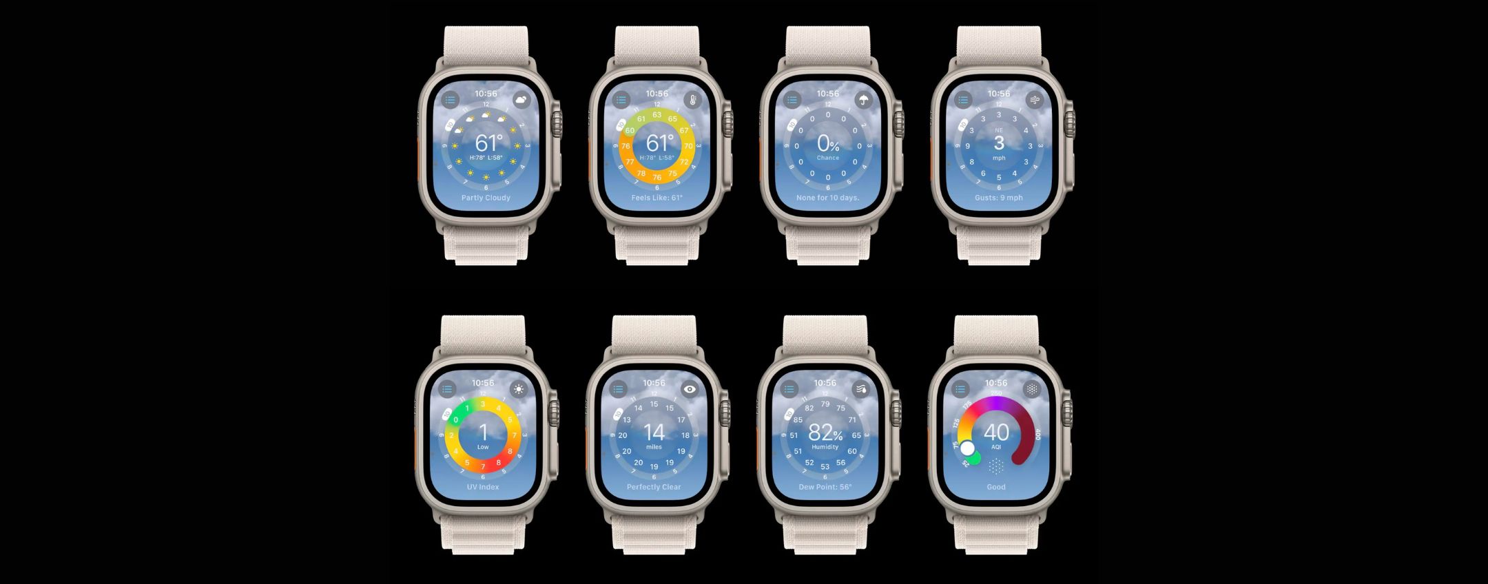 La nuova app Meteo di Apple Watch in watchOS 10 sfrutta in modo efficace il display dell’Apple Watch, offrendo agli utenti una maggiore quantità di informazioni meteorologiche direttamente al polso. Oltre a una grafica rinnovata, l’app offre otto categorie di dati meteorologici visualizzabili sulla schermata principale, nell’interfaccia oraria e nelle previsioni a 10 giorni. Inoltre, lo sfondo dell’app si adatta alle condizioni meteorologiche attuali, fornendo un’esperienza visiva coinvolgente.