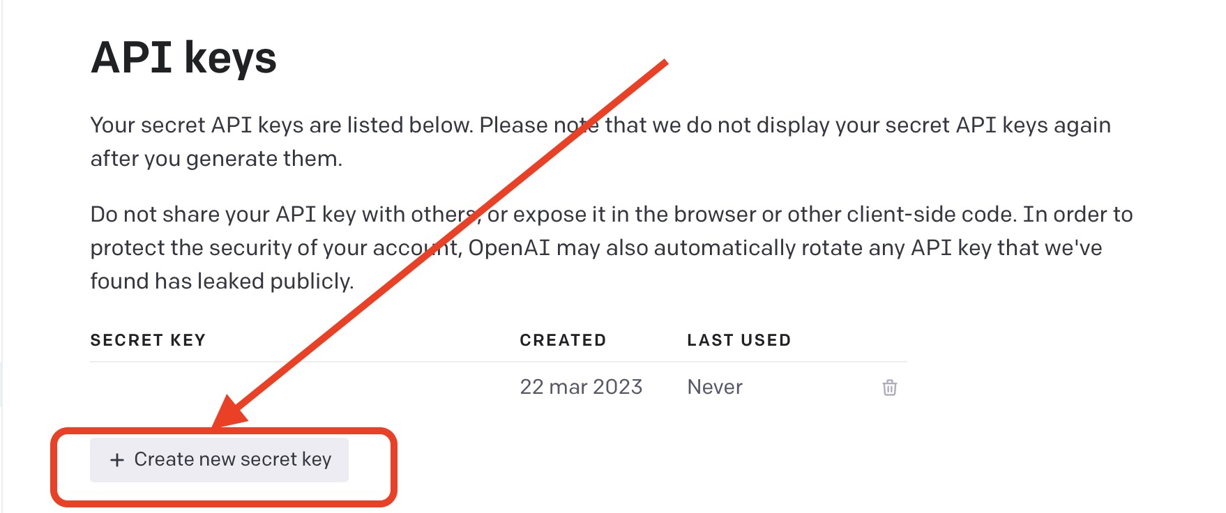 - Aprite questa pagina Web e immettete le credenziali se necessario, dopodiché fate clic su “+Create new secret key”.