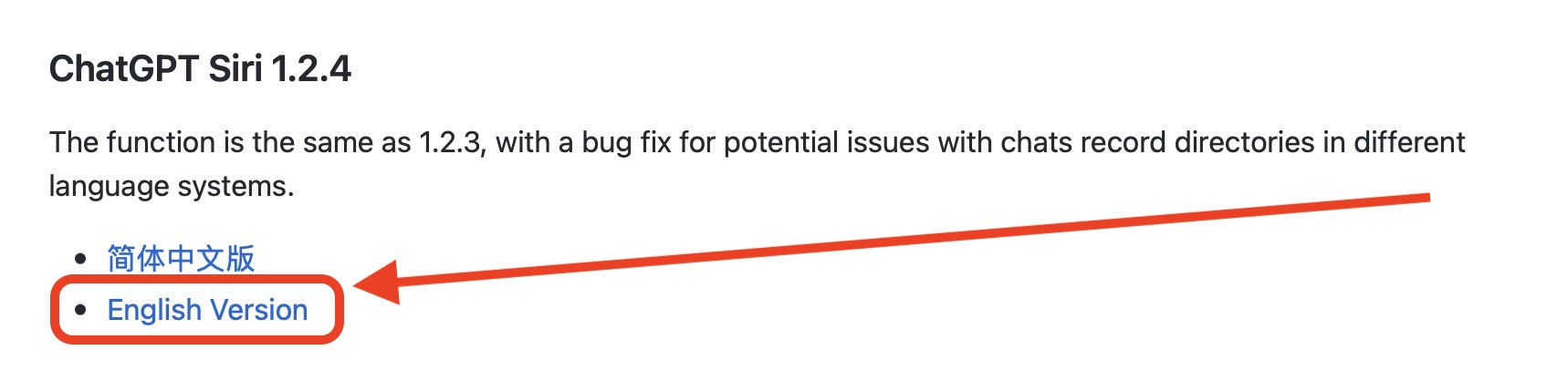 - Scorrete verso il basso fino a individuare l’ultima versione della Scorciatoia. Al momento della stesura del post, è la ChatGPT Siri 1.2.4. Ovviamente dovrete fare clic su English Version come indicato nell’immagine qui di seguito. Non vi preoccupate, ChatGPT parlerà in italiano alla fine.