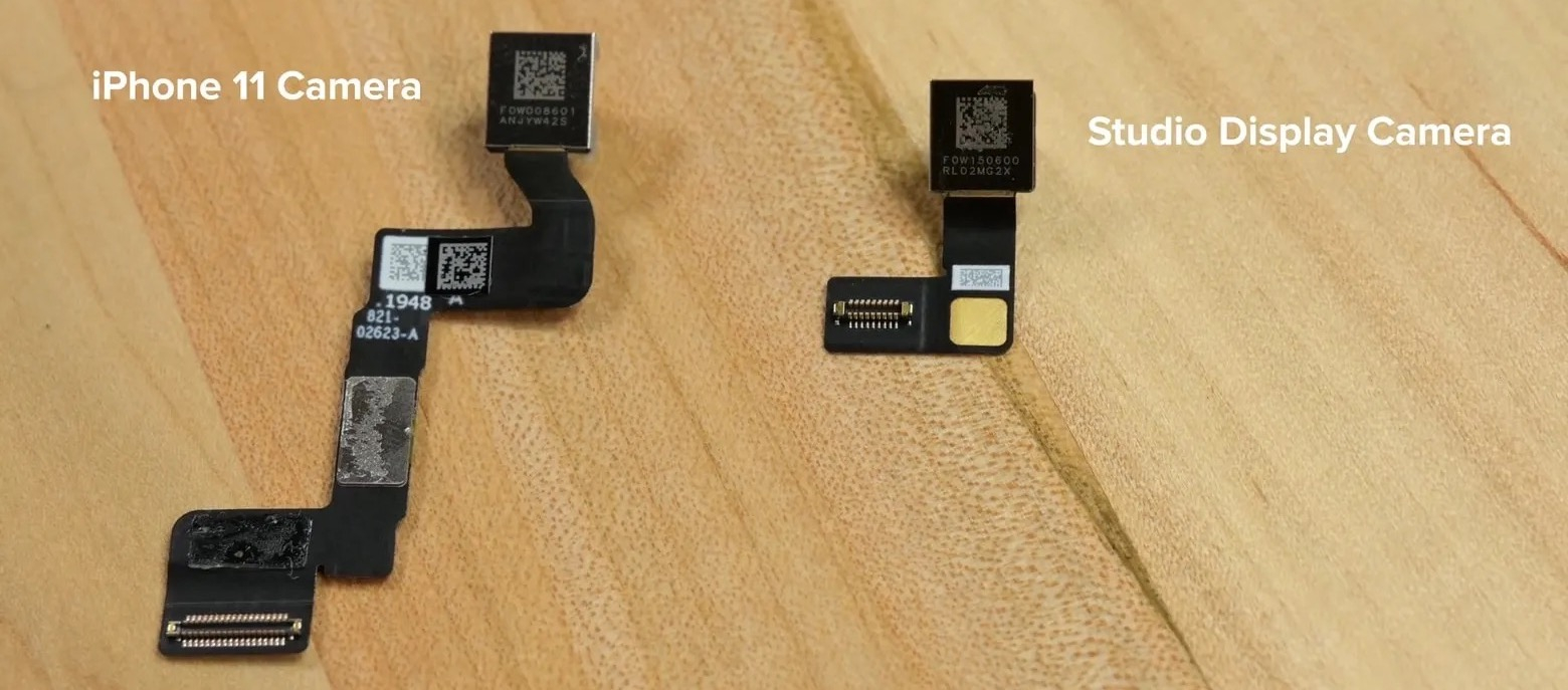 Quello che vedete qui su, invece, è il modulo fotocamera dello Studio Display, messo a confronto col suo omologo per iPhone 11. ” Anche la fotocamera frontale di iPhone di un paio d’anni fa era da 12 Megapixel con Ultragrandangolo, e a livello hardware sembrano abbastanza identiche” chiosa iFixit.