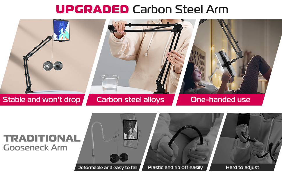 Il braccio rinforzato del supporto è completamente regolabile in altezza e angolazione, rendendolo perfetto per una vasta gamma di situazioni, come a letto, sul tavolo o addirittura in piedi (magari come leggio musicale). Grazie alla sua capacità di rotazione a 360°, è possibile posizionare il tablet nella posizione desiderata con facilità.