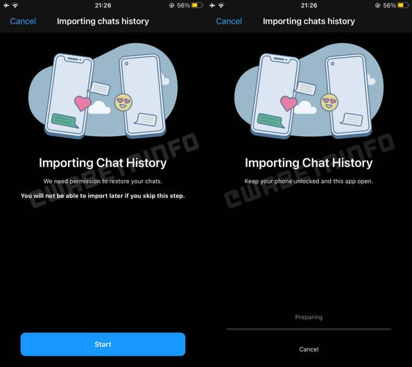 I due screen condivisi confermano che è attualmente in fase di test una feature per consentire la migrazione dei messaggi scambiati con la popolarissima app di Meta. Tale trasferimento avverrebbe tuttavia tramite cavo, e non un cavo qualunque.