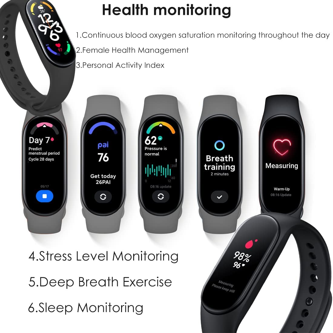 Permette di organizzare i dati e conoscere il massimo consumo di ossigeno (VO₂max) e programmare di conseguenza le fasi di recupero. Xiaomi Mi Band 7 può visualizzare direttamente l’ora, i passi, le informazioni sulla frequenza cardiaca, il promemoria delle vibrazioni e visualizzare direttamente i dettagli di chiamate, messaggi o altre notifiche da Facebook, Twitter o Instagram.